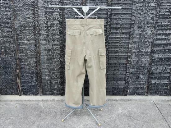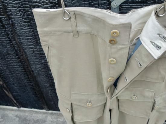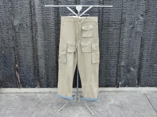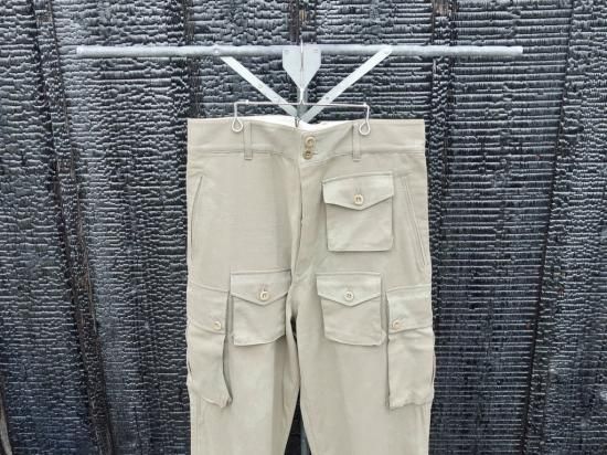 アメリカ軍のファティーグパンツとフランスのパラシュート部隊が着用したパンツから着想を得て、ドッキングさせました。ショーン・フリンはカメラギアを収納しておくためのポケットを足すなど、自らの手で多くのウェアをカスタムしたのです。※画像からも感じる、表面の掠れた様なまだらな印象はこのパンツの特徴になります。