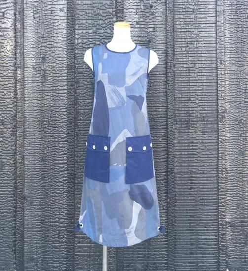 綿100%のファブリックにUK camo(D.P.M./Disruptive Pattern Material)とUS camo(フロッグスキンカモ)柄がプリントされ、船乗員が着用したシャツについた洗濯後に吊るすためのループのデザインを裾のディテールに取り入れたリバーシブルのプルオーバードレスです。D.P.M.カモの面には、英国らしいベローズポケット、もう片面にはパッチポケットがセットされ、英米両国のディテールを1着のドレスでお楽しみいただけます。