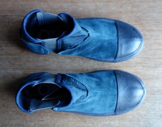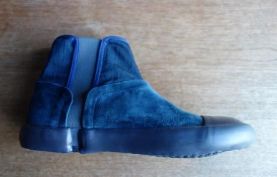 LEATHER 牛革(スエード)とポリエステルをベースに丁寧に作られている印象です。aro(アロ)のロゴマーク(ゴムのような素材)が足首の背面にしっかりと縫い付けられています。足首〜サイドソールまでの内・外側にはサイドゴアブーツのような灰色のしっかりとしたゴム素材が縫い付けられており伸縮性がございます。インナーソールは着脱可能です。インナーソールの裏側かかと部分には硬めのゴムのような素材が貼られクッション性を高める工夫がされております。アウターソールはボコボコとしたグリップ力を高める工夫がされており滑りにくい構造をしております。素材の切り替えし(スエードとポリエステル)の部分が面白い印象で、この靴の表情を豊かにしているデザインと言えます。※色の表記はBLUEとなっておりますが、感じ方によっては深い緑色に感じると思われますが、このなんとも言えない深い緑のようなBLUEがまたたまらなく素敵なのです!