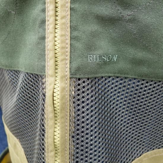 11オンスの綿100%のオイルフィニッシュを施した生地をベース(フロントポケット含む)に胸部分には12オンスの綿100%モールスキン、その他メッシュを機能的に配し構成されているシューティングベストです。ノーカラーのVゾーンの下端からはじまるジッパー開閉で、前面腰部付近の左右にマチ付きスナップボタンで調整可能な立体的ポケット(銃弾を詰め込めるなどの仕切りポケット、雨が溜まりにくいようにアイレットあり)、後面腰部付近には左右の上から手を突っ込むことができる使用済みの銃弾などを入れとけるメッシュポケットは一気に取り出せる様に下部はジッパー開閉可能となっています。ちょっと変わり種のアウトドアシーンなどでも活躍が期待できるフィルソンという個性を放ったロング丈のベストは要所がメッシュ仕様となっているのでどことなく涼しげです。カットソーやシャツ、アウターウェアなどの上からも使用することが可能です。