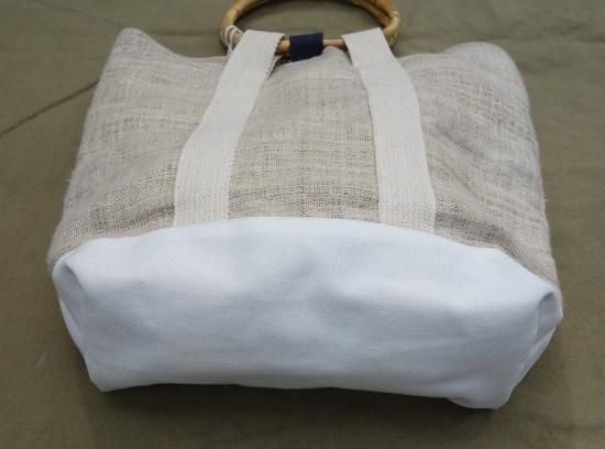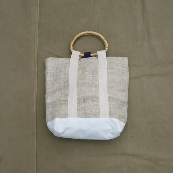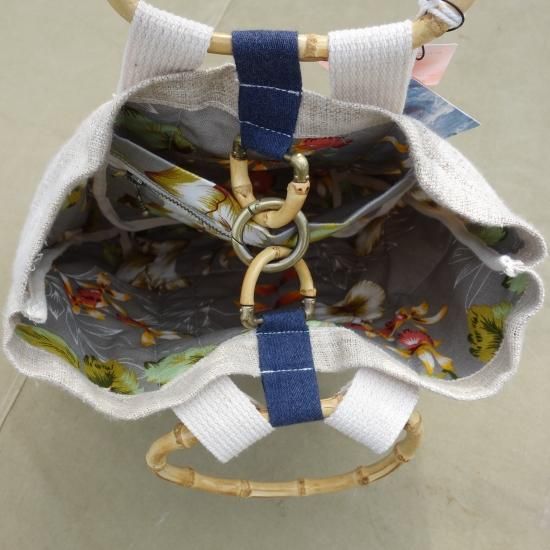 BOAT BAG には外側に手織りの麻生地が使われ、耐久性を保つ為、ベース部分には16ozのキャンバス地で補強がされております。ハンドルと内部の留め具の一部に天然素材の竹が使われ、表情にアクセントをつけています。内部のライニングにはトロピカルな花柄のコットン素材が縫い合わされ、要所にツイルテープでパイピング仕上げされています。内部にはジッパー付きのポケットが1つ用意されているのも嬉しいポイントです。