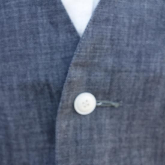 天然の木の実(椰子)から作られたコロゾボタン(ホワイト色)を4つ配したノーカラーのWAISTCOATとなります。ブラックに染められたブラッドフォードデニムは表情が豊かで、深くて大きめなポケットが2つセットされ、後ろ身頃の腰部には尾錠がセットされクラシックな雰囲気も持ち合わせています。内側はきちんと裏地が縫い合わされ丁寧に仕立てられています。※裾の両サイドには約4 cmほどのスリットが施されています。