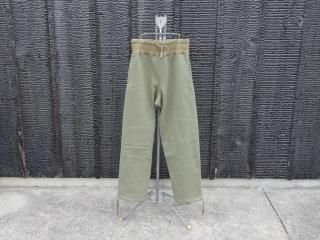 ナイジェルケーボンが展開するファブリックの中でも上位人気を誇るMOLESKIN(モールスキン)の生地で仕立てられており、英国陸軍が第一次大戦で運用していたパンツをベースにしたデザインで、その名もTOMMY’S PANTです。スソにニットのリブがセットされており、ブーツインし易いようにデザインされている点が最も大きな特徴です。一般的に歩兵のためだけのディテールのように捉えられていますが、フライトパンツにも散見される仕様です。歩くはずのないコクピットに不似合いな印象ですが、これは座席中央に設置された操縦桿、そして両足で踏むラダーペダルの操作時に、邪魔にならないよう考慮されているためです。車のペダルに何かが絡まると重大事故に繋がることを想像してもらうと判りやすいかもしれません。スソのニットは、縫い目のないシームレスです。これにより、編地の重なりが解消され、不快なごろつきが無くなります。繋ぎ目のある普通のリブは、カットして縫い合わせるだけなので簡単に作ることができますが、本製品のようなリブは、専用の丸編み機でしか作る事ができません。編み機自体の存在もまた稀少です。その他、フラップ付きのポケットなど計6つのポケットがセットされ、ジッパーフライで、初めからサスペンダーボタンがセットされているのでクラシック的な着こなしも可能です。