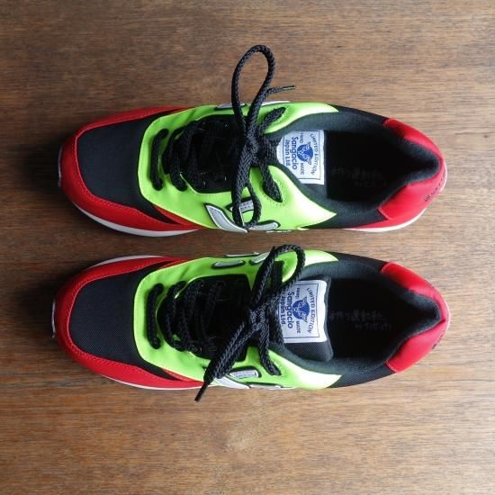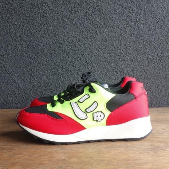 両サイドにしっかりと縫い合わされた”にゅ”がトレードマーク。とってもユニークなスニーカーですが、ホールド性・クッション性に富んだ斬新なスニーカーでしかっりと作り込まれています。アッパー生地のカラーリングは”にゅ”の部分が蛍光イエロー、つま先とかかとがレッド、その他がブラックで埋め尽くされ、ソールはホワイト&ブラックとなっています。履くと案外コーディネートし易く履き心地にも優れた話題性あるスニーカーを存分にお楽しみください。