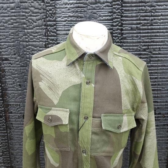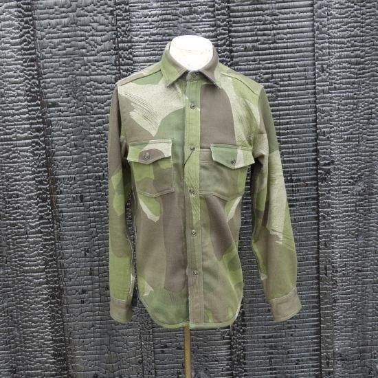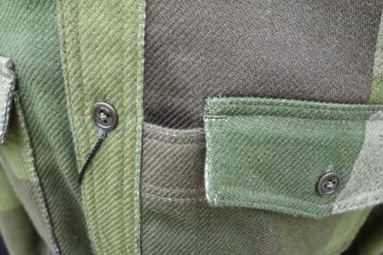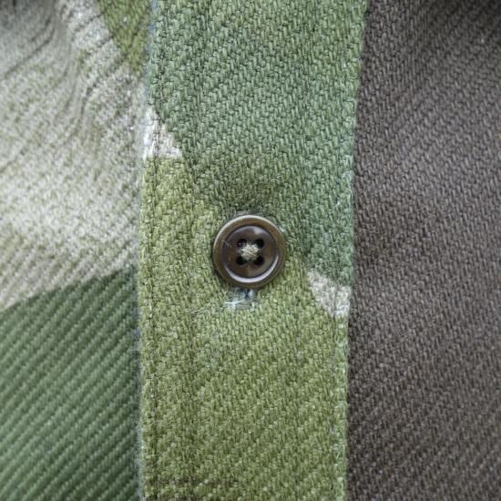 REVERSIBLE CAMO / CHECK(リバーシブル カモフラージュ & チェック)素材(下記参照願います。)で仕立てられたシャツです。こちらはネーミング通りリバーシブルに着用もできるようボタンなどに細工が施されております。襟付きで、胸元の左右にはフラップ付きのポケットがセットされ(左側のポケットにはペン差しが隣り合わせになっています。)、袖口もリバーシブルに対応するボタンがセットされ開閉することが可能です。気分次第でボタンなど付け替える必要のない UK CAMO(DPMカモ)と青・緑・グレー系のチェック柄とのリバーシブルはわずらわしさを感じさせません。裾はきちんとパイピング処理されるなど肉厚でしっかりと丈夫に仕上がっております。