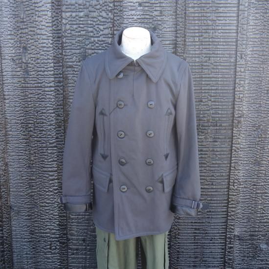 日本と同様に四方を海で囲まれた英国にとって、沿岸警備隊の役割は他国からの侵攻に対し警備するだけではなく、密輸防止・追跡・逮捕、海難防止・捜索・救助など多岐に渡ります。その任務は非常に困難なものを多く含み、装備もそうした過酷な環境に耐えられるものであることが要求されます。風の吹き付ける方向によって、左右どちらでも合わせられる前身頃。ファスナーや金属ではなく腐食しない素材のボタン。雨風をシャットアウトするための大きな衿。これらが、伝統的なPコートのスタイルです。本製品は、さらにヴィンテージウェアのデザインディティールを正確に再現しています。袖口、衿などすり切れやすい部分には補強のため頑強なレザーをセットしています。ポケットの両端に三角形のレザーパーツが配されているのも同様に補強のためです。両腰のフラップ付きポケットの上部に、さらに一対のポケットが装備されています。下部のそれは装備品などを収納するための物で、フラップは内容物の脱落防止のためです。上部のポケットは、収納ではなく、ハンドウォーマーとしての機能が優先するように考えられています。ヒトの体の中心、すなわち最も体温の高い部分に位置するように計算され配置されているのです。また、外見からはわかりませんが、袖口にはウールのリブがセットされ体温の流出を防ぐと共に、作業の際に袖口を固定する役割を兼ね備えています。
