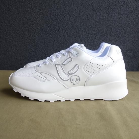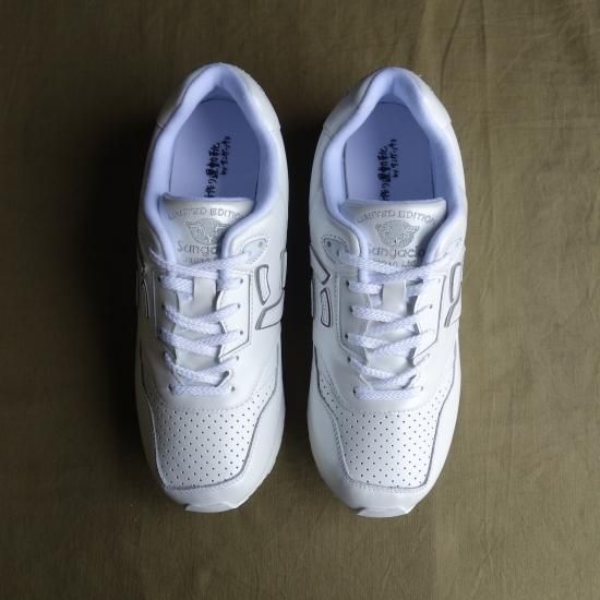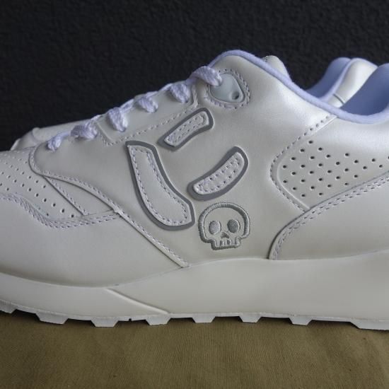 パールホワイトに輝く本革の素材をベースに両サイドにしっかりと縫い合わされた”にゅ”がトレードマークと言いたいところなのですが、こちらは "に+にスカル”、更にカカトの刺繍は「Sangacio Tokyo」の特別仕様となっている限定バージョンです。とってもユニークなスニーカーですが、ホールド性・クッション性に富んだ斬新なスニーカーでしかっりと作り込まれています。履くと案外コーディネートし易く履き心地にも優れた話題性あるスニーカーを存分にお楽しみください。全体を白で統一したカラーリングは秋冬の重くなりがちなコーディネートに重宝すること間違いなし。※ご購入いただいたお客様へ前回ノベルティとして製作し大きな反響を頂いた特製キーホルダー『にスカル』版をプレゼントいたします。