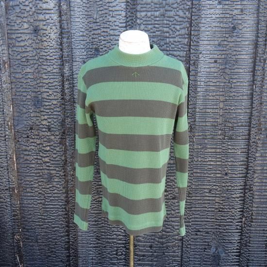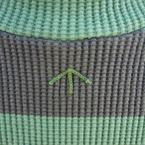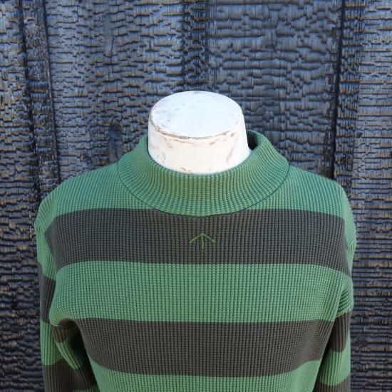 伸縮性のある "WAFFLE(ワッフル)" 素材のハイネック・長袖のストライプ模様カットソーです。首元の中央にはナイジェルケーボンらしいブロードアローのハンドル刺繍が施され、保温性・保湿性を保つ一着は何かと重宝するユーティリティー的なアイテムになってくれることでしょう。ナイジェルケーボン自身愛用しているアイテムです。