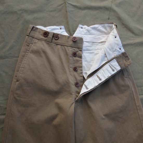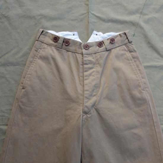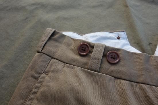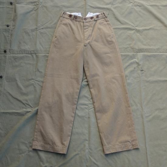 5ポケットのボタンフライのベーシックなミリタリー チノパンツです。バックシンチでウエスト調整が可能で初めからサスペンダーボタンがセットされているのでクラシックな着こなしも可能です。