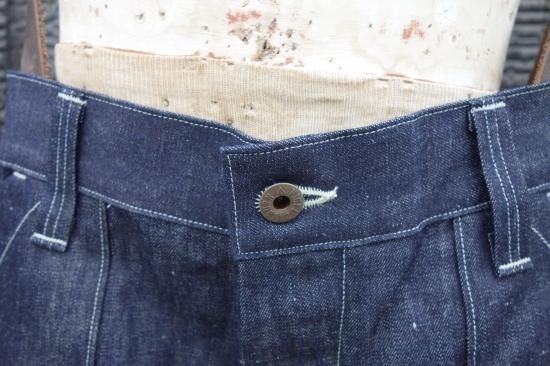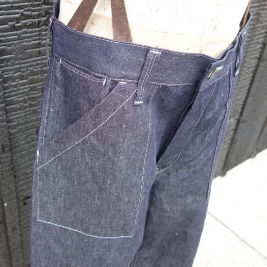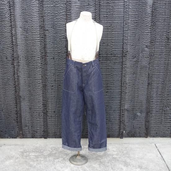 ボタンフライ・サスペンダーボタンが内側に仕込まれている 5 ポケットのワイドシルエットのパンツと言えます。着込むことで経年変化による風合いの変化や表情の変化を楽しめる育てがいのある1本になってくれることでしょう。サスペンダーで吊ってクラシックな着こなしもお楽しみいただけます。